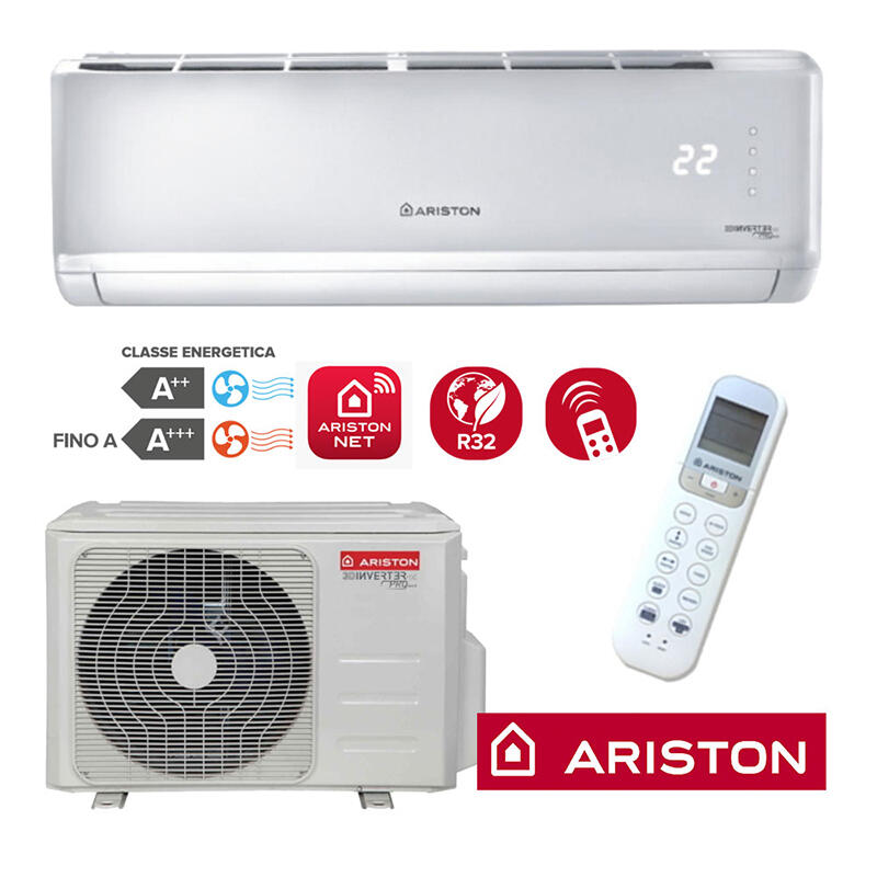 Climatizzatore monosplit a parete Ariston con tecnologia Inverter da 9000 BTU Modello ALYS R32 C35 MUD0 da 12000 Btu in classe fino a A+++/A++ e nuovo gas ecologico R32, con predisposizione Wi-Fi ready e doppio inverter nell'unità esterna per una maggiore efficienza e migliore gestione dei consumi. Tecnologia 2D, gestione della ventilazione e tante altre funzioni.
